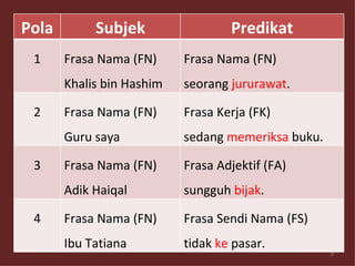FK Pola 3 Sahabatku FN pintar sekali. Pola 4 Abang FN ke kedai bukuFS Dalam Pola 1- 4 Frasa Nama FN berfungsi sebagai subjeknya. Empat pola ayat dasar dengan unsur-unsurnya boleh dilihat seperti berikut.